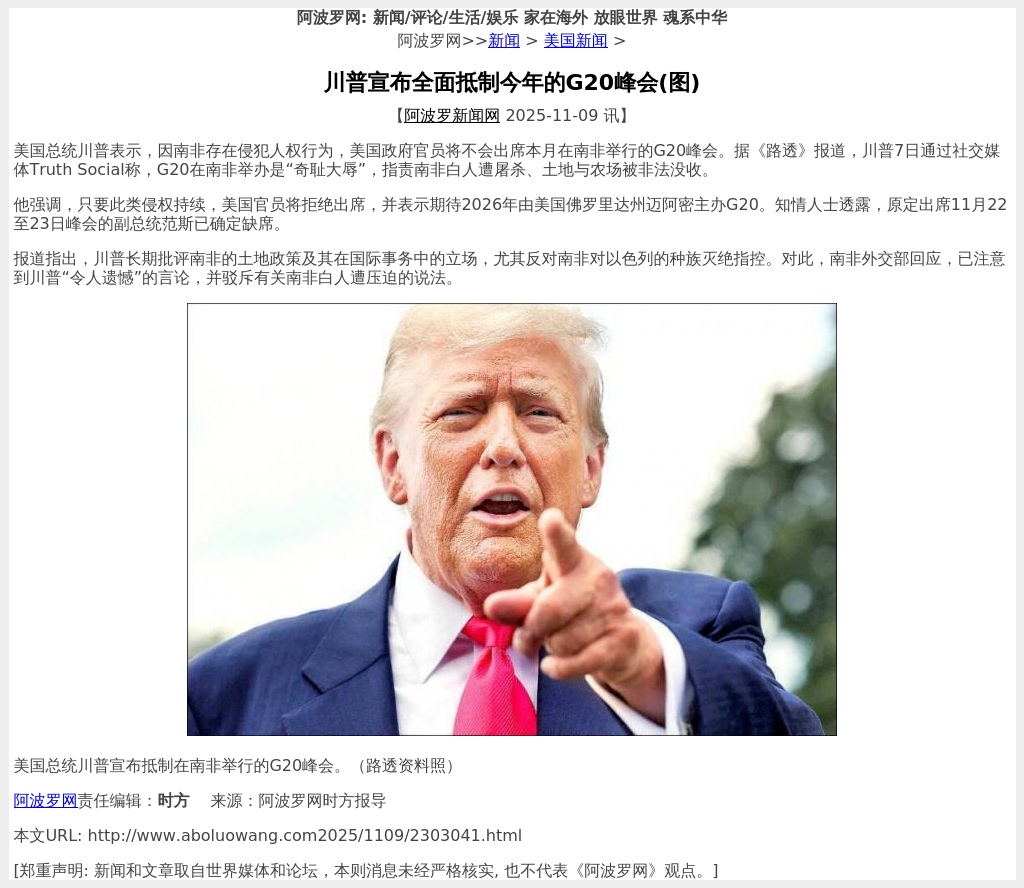 他強調,只要此類侵權持續,美國官員將拒絕出席,並表示期待2026年由美國佛羅里達州邁阿密主辦G20。知情人士透露,原定出席11月22至23日峰會的副總統范斯已確定缺席。