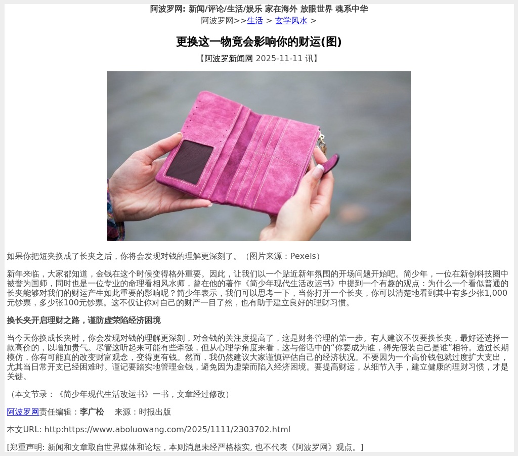 當今天你換成長夾時,你會發現對錢的理解更深刻,對金錢的關注度提高了,這是財務管理的第一步。有人建議不僅要換長夾,最好還選擇一款高價的,以增加貴氣。儘管這聽起來可能有些牽強,但從心理學角度來看,這與俗話中的「你要成為誰,得先假裝自己是誰」相符。透過長期模仿,你有可能真的改變財富觀念,變得更有錢。然而,我仍然建議大家謹慎評估自己的經濟狀況。不要因為一個高價錢包就過度擴大支出,尤其當日常開支已經困難時。謹記要踏實地管理金錢,避免因為虛榮而陷入經濟困境。要提高財運,從細節入手,建立健康的理財習慣,才是關鍵。