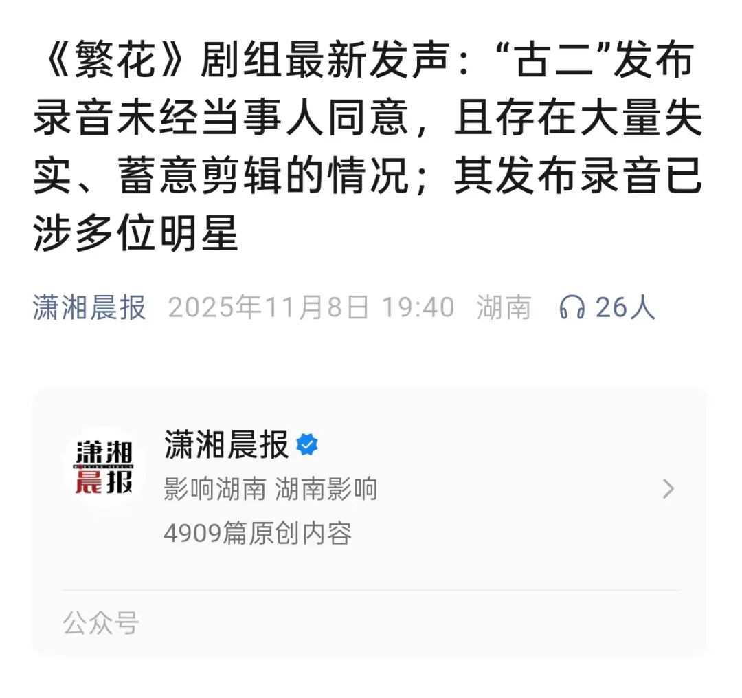 一邊是《繁花》劇組公開聲討古二,譴責其發布的錄音未經當事人同意,且存在大量失實、蓄意剪輯的情況。