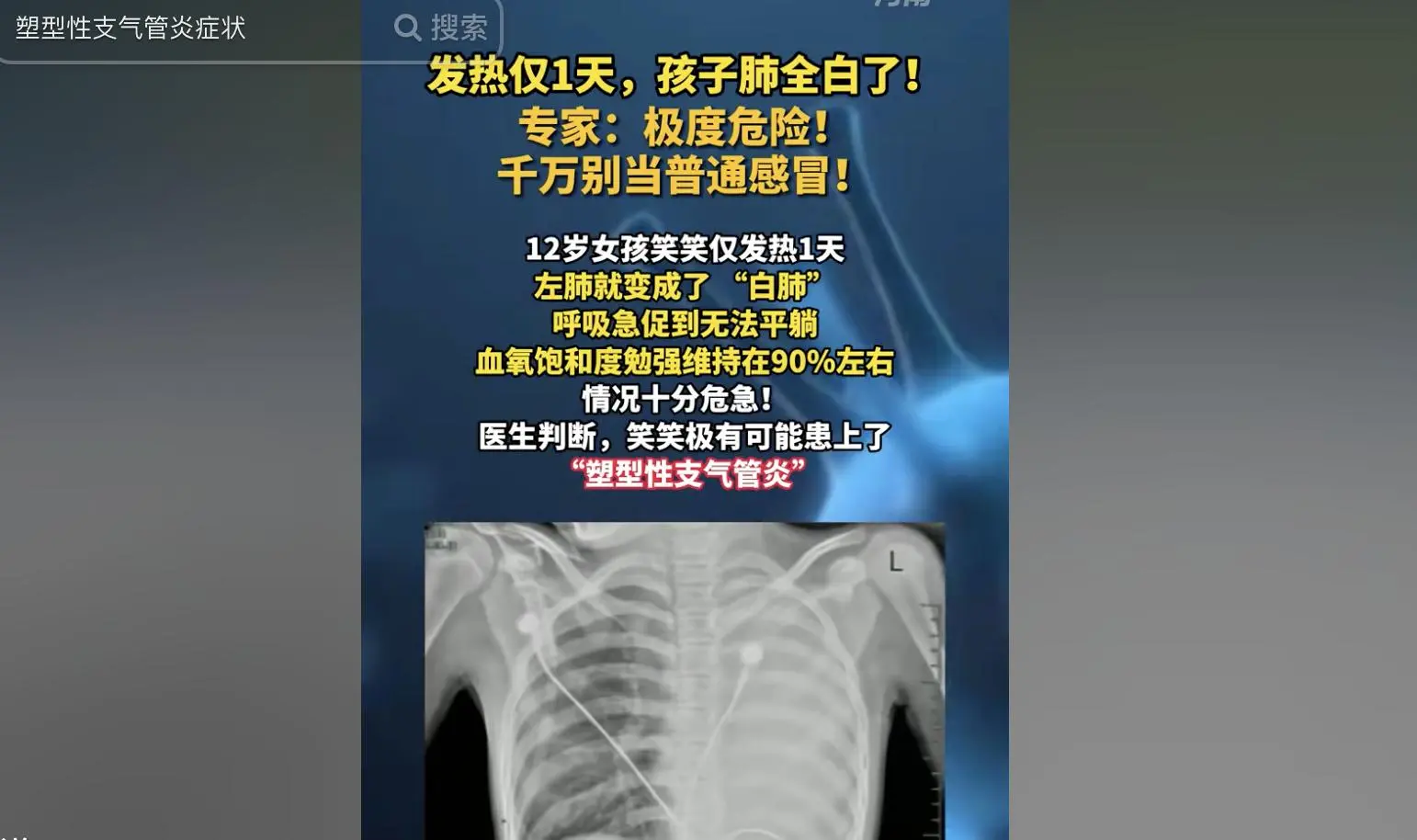 中國流感疫情急劇升溫。浙江一名12歲女孩僅發熱一天,左肺就變成了「白肺」。醫生強調切勿當作普通感冒,指該女孩極有可能是患上了塑型性支氣管炎,但後續報導指女孩是感染了毒力極強的銅綠假單胞菌,多發生在免疫功能低下人群。大陸網民懷疑是打新冠疫苗的後遺症。