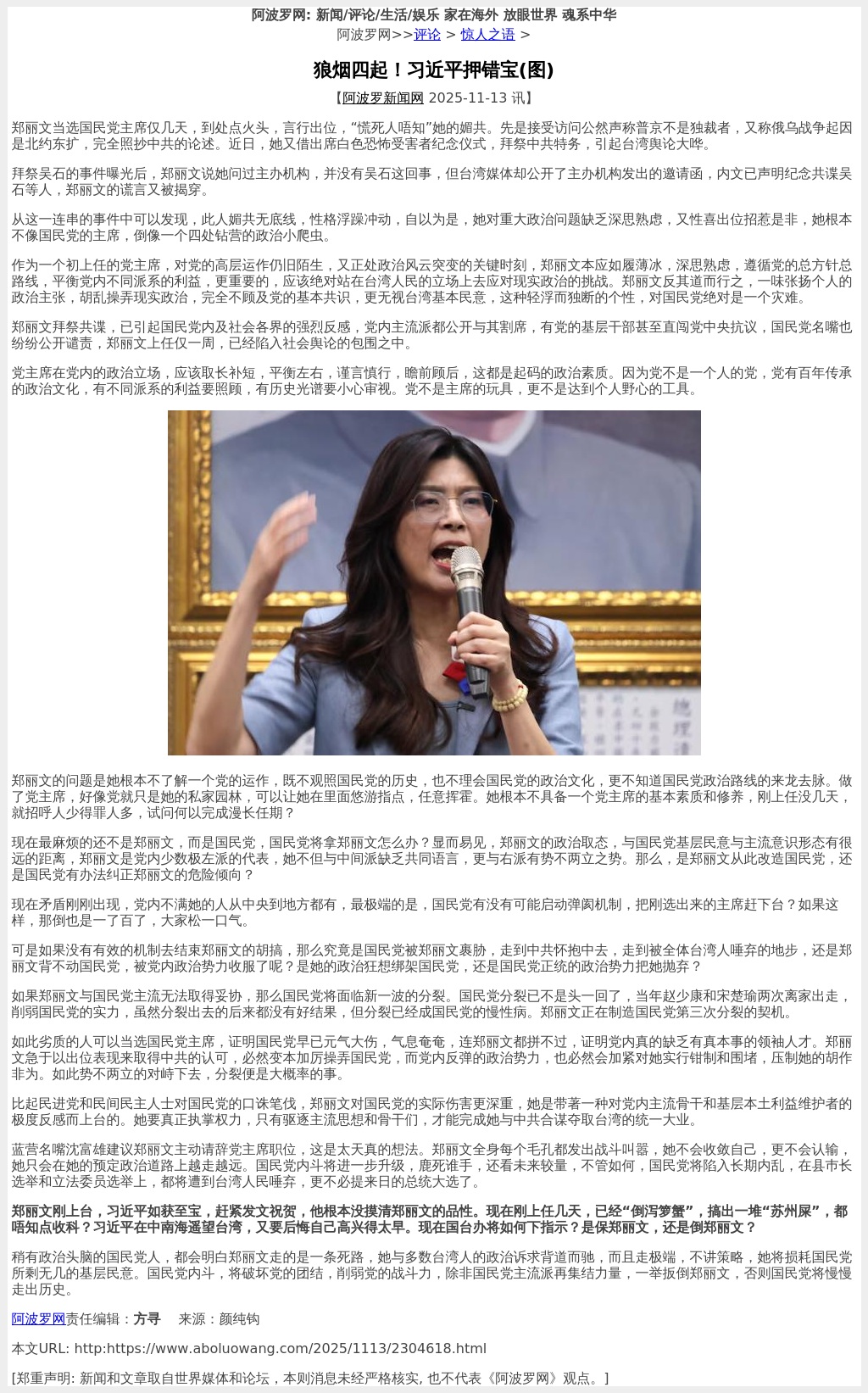 鄭麗文剛上台,習近平如獲至寶,趕緊發文祝賀,他根本沒摸清鄭麗文的品性。現在剛上任幾天,已經「倒瀉籮蟹」,搞出一堆「蘇州屎」,都唔知點收科?習近平在中南海遙望台灣,又要後悔自己高興得太早。現在國台辦將如何下指示?是保鄭麗文,還是倒鄭麗文?