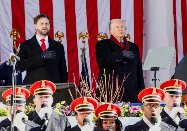 川普總統(後右)與副總統范斯(後左)11日參加維州阿靈頓國家公墓舉行的退伍軍人節典禮。(路透)