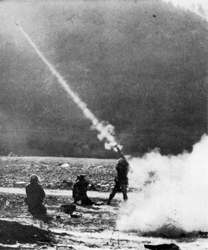 1950年11月3日,美軍士兵在戰鬥中操作M20火箭發射器攻擊敵軍山上的陣地。(美國陸軍歷史中心)