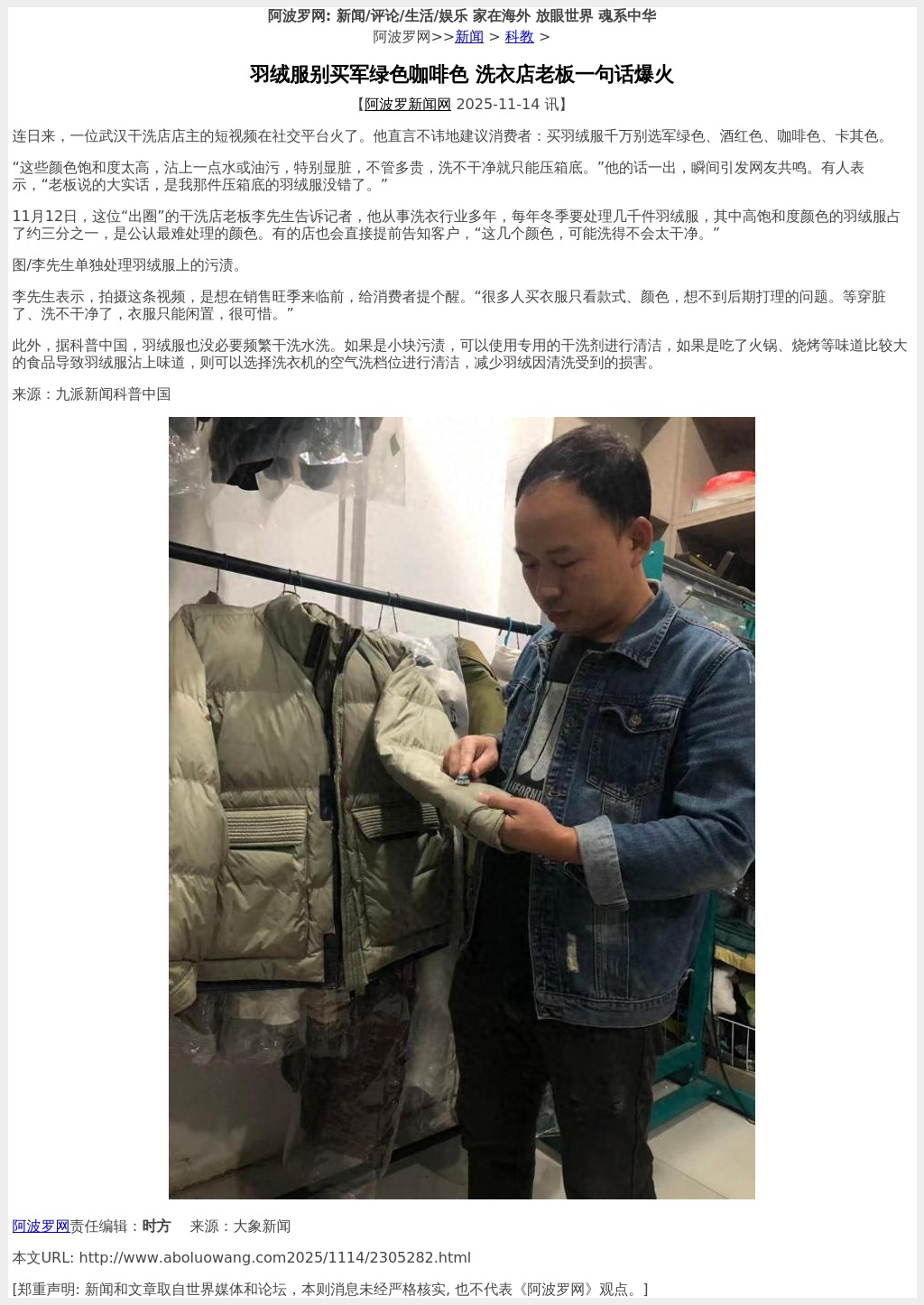連日來,一位武漢乾洗店店主的短視頻在社交平台火了。他直言不諱地建議消費者:買羽絨服千萬別選軍綠色、酒紅色、咖啡色、卡其色。