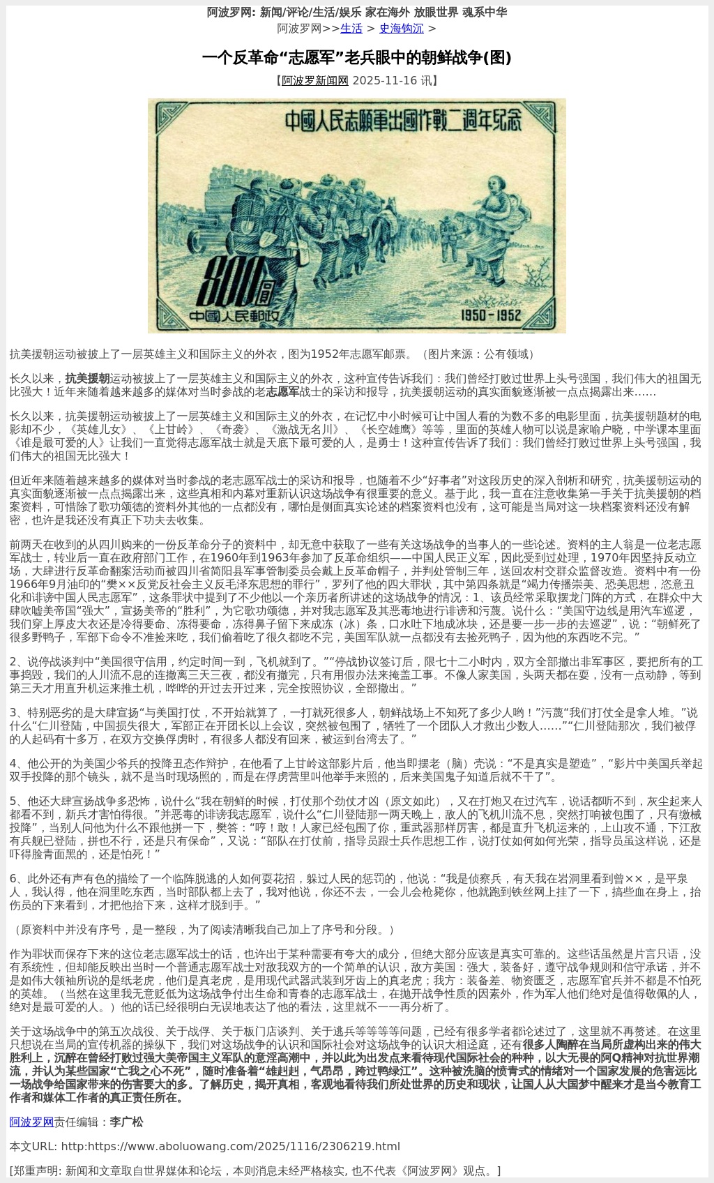 但近年來隨著越來越多的媒體對當時參戰的老志願軍戰士的採訪和報導,也隨著不少「好事者」對這段歷史的深入剖析和研究,抗美援朝運動的真實面貌逐漸被一點點揭露出來,這些真相和內幕對重新認識這場戰爭有很重要的意義。基於此,我一直在注意收集第一手關於抗美援朝的檔案資料,可惜除了歌功頌德的資料外其他的一點都沒有,哪怕是側面真實論述的檔案資料也沒有,這可能是當局對這一塊檔案資料還沒有解密,也許是我還沒有真正下功夫去收集。