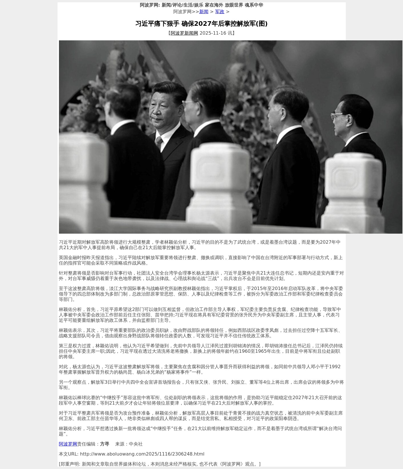 習近平近期對解放軍高階將領進行大規模整肅,學者林穎佑分析,習近平的目的不是為了武統台灣,或是著墨台灣議題,而是要為2027年中共21大的軍中人事提前布局,確保自己在21大後能掌控解放軍人事。