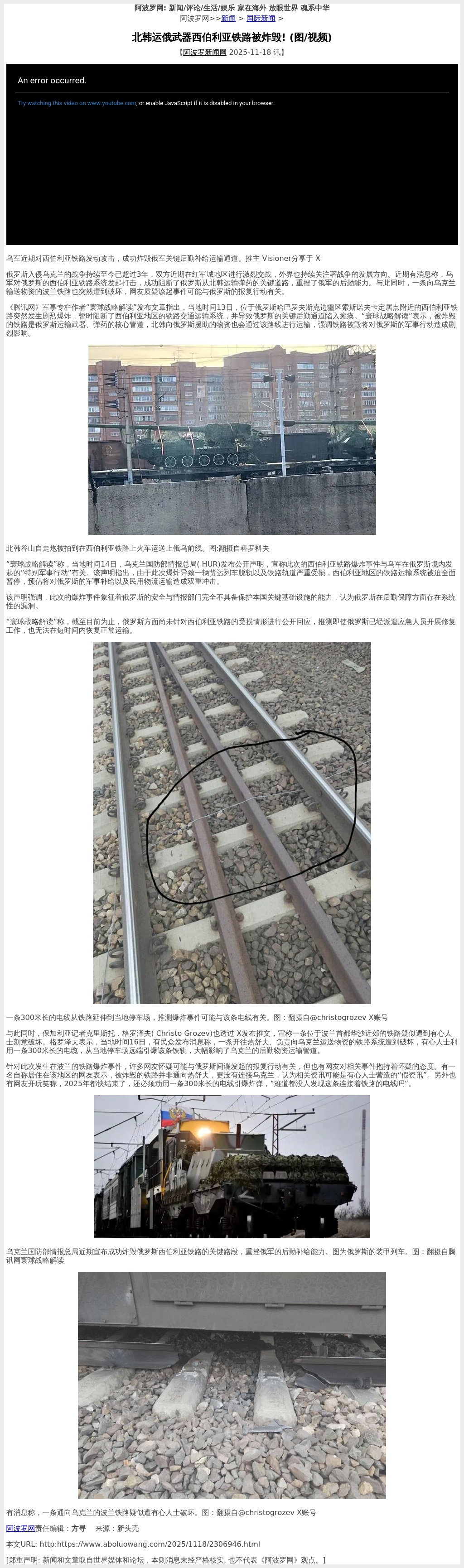 《騰訊網》軍事專欄作者「寰球戰略解讀」發布文章指出,當地時間13日,位於俄羅斯哈巴羅夫斯克邊疆區索斯諾夫卡定居點附近的西伯利亞鐵路突然發生劇烈爆炸,暫時阻斷了西伯利亞地區的鐵路交通運輸系統,並導致俄羅斯的關鍵後勤通道陷入癱瘓。「寰球戰略解讀」表示,被炸毀的鐵路是俄羅斯運輸武器、彈藥的核心管道,北韓向俄羅斯援助的物資也會通過該路線進行運輸,強調鐵路被毀將對俄羅斯的軍事行動造成劇烈影響。